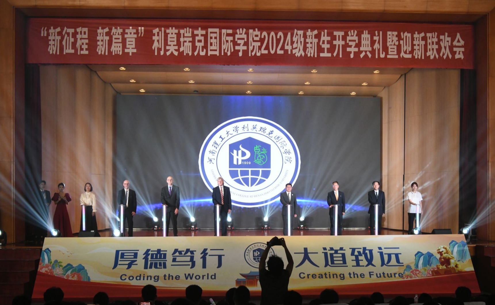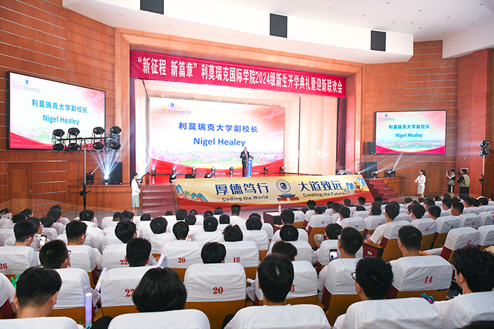 2024级新生开学典礼暨迎新联欢会在校明德楼音乐厅举行。校党委书记邹友峰、党委副书记解伟,副校长李振华、边亚东等校领导,爱尔兰利莫瑞克大学副校长Nigel Healey(奈杰尔·希利)等一行,学校相关职能部门和麻豆社