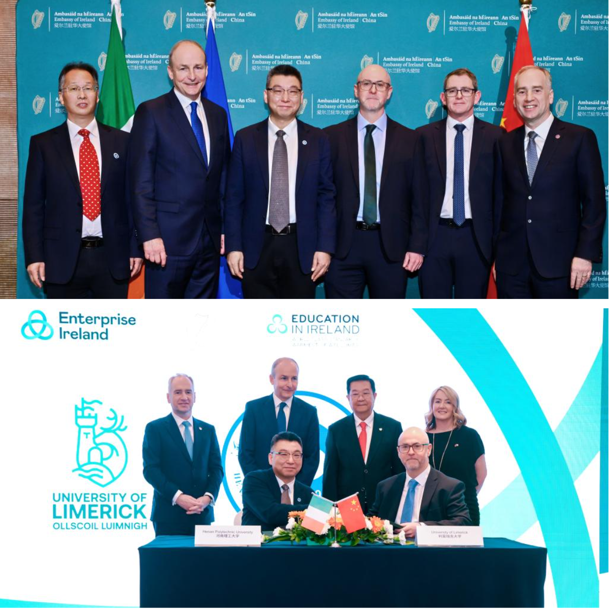 1月6日,“中爱中外合作办学推广”活动在北京举行。应爱尔兰大使馆邀请,校长赵同谦出席活动,与利莫瑞克大学副校长科林·菲茨帕特里克进行会谈,并在爱尔兰总理米哈尔·马丁、爱尔兰驻华大使欧博仁等的见证下,签署深化合作联合备忘录。